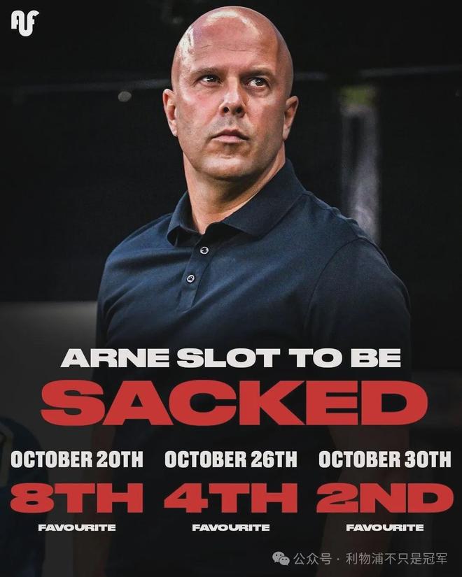 《每日邮报》则透露,斯洛特的下课赔率已经“高居”英超第二。第一是前9轮2平7负只有2分排名倒数第一的狼队主帅。并且,短短10天之内,斯洛特的下课赔率已经从第8位“疯狂蹿升”到第2位。